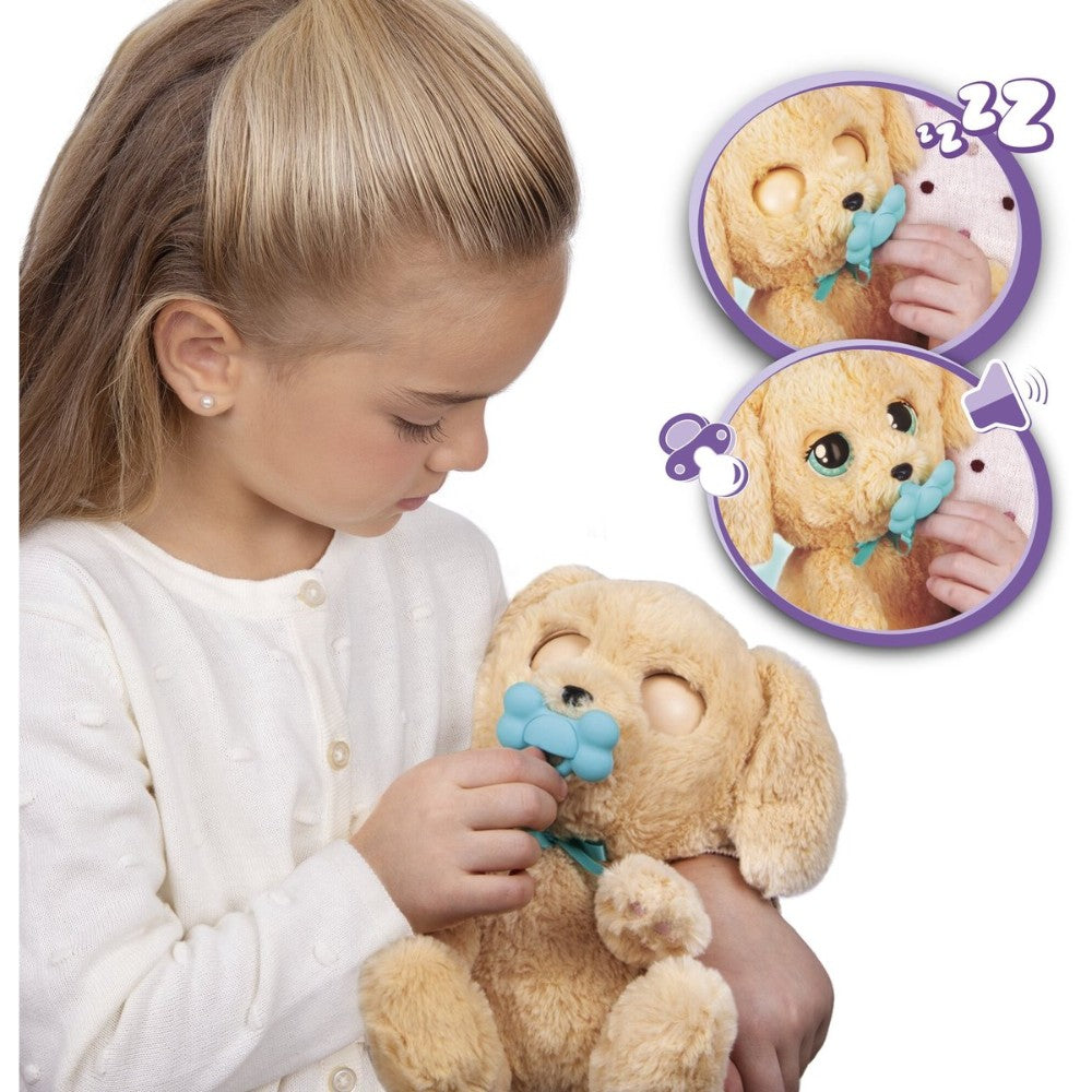 Baby Paws Labrador is a blonde Labrador with a super soft coat, making it just like a real puppy! Labrador is sleeping soundly in a turquoise blanket with a fun print. With a pacifier in his mouth and his eyes closed. Open the blanket and discover a soft, flexible body with movable legs. As soon as you take the pacifier out of his mouth, his eyes open and he makes the sweetest sounds. And when you’re not playing with him, he’ll beg for your attention. Put the pacifier back in his mouth, and his eyes close again and you’ll hear sweet sleepy sounds. Sleep tight, Labrador! The blanket has a handy handle, so you can take your Labrador with you everywhere! Download the free “Baby Paws” app, where you can fill out a personalized passport for your Baby Paws. The app also has all sorts of interactive features to help you feed and care for your Baby Paws puppy. Under the guidance of a veterinarian, you’ll play various mini-games that teach you how to care for your new puppy. Baby Paws Cocker is your new best friend! Dimensions: 20 cm tall. Battery information: 2 x AAA batteries (included).