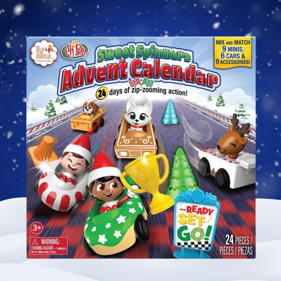 24 days of zip-zooming action! The race to Christmas is on! Count down to Christmas with the sugar-spun fun of an Advent calendar filled with The Elf on the Shelf and Elf Pets! Advent calendar is filled with The Elf on the Shelf and Elf Pets playable mini figures and sweet rides straight from Santa’s North Pole!