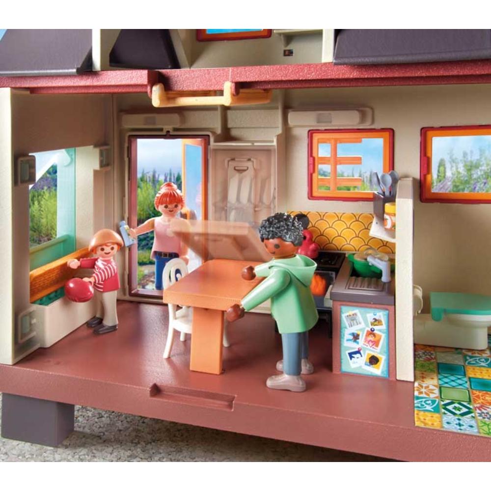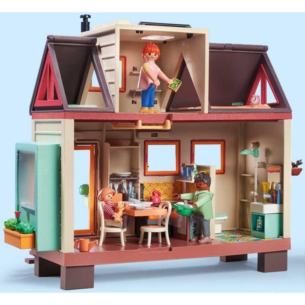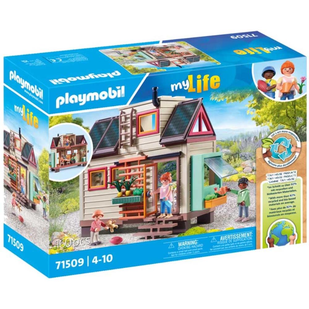 Small house, big family fun! Move into your own little family haven with the Tiny House play world from PLAYMOBIL. The Tiny House offers everything your heart desires: Downstairs, theres the dining and kitchen area with a stove, sink, and refrigerator, as well as a folding table, and the bathroom with a shower and toilet. The foldable ladder leads up to the attic. Here, a childrens room and two sleeping spaces for adults are located. Outside, a vertical garden and flower box allow for growing fruits and vegetables for personal use, and solar panels on the roof support the power supply. This little house leaves no living desires unfulfilled!