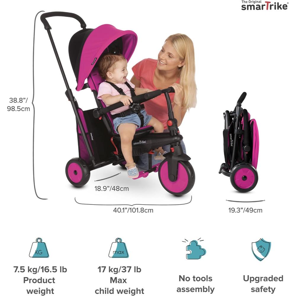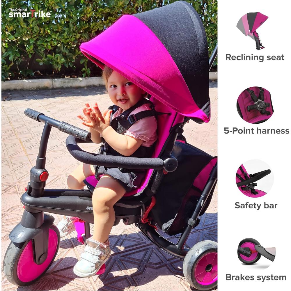 SmarTrike STR3 6 in 1 tricycle pink for convenient transport and storage, it can be folded up in just a few clicks, with our effortless touch steering technology, simply walk and drive and hand over the steering to your child in an instant. STR3 6 in 1 tricycle is designed to help your baby develop their motor skills, confidence and balance while learning to drive independently.