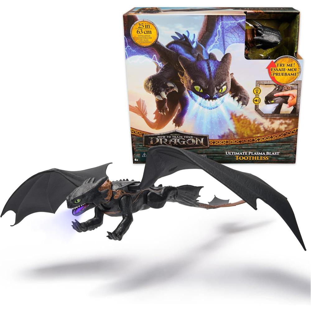 Toothless features authentic movie styling, with real feel dragon wings and a 25-inch wingspan. Press the button on Toothless’ back to charge his blast, then press it again to activate his blue plasma light and chomping action with sound.