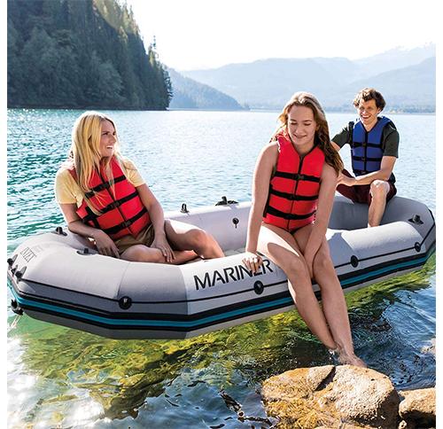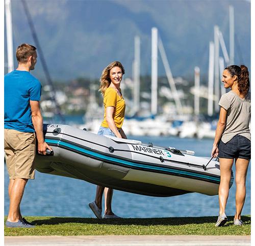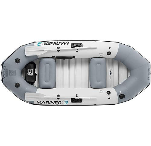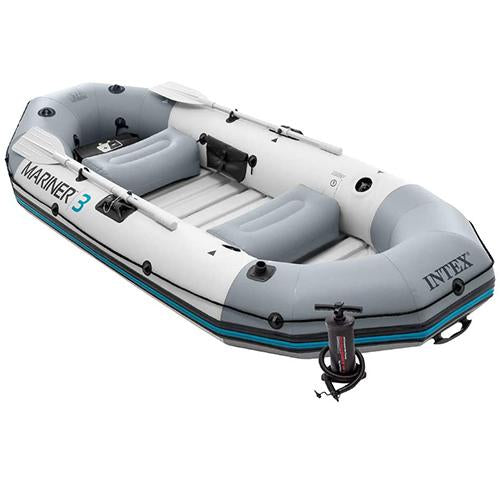 The Intex Mariner 3 inflatable boat is constructed for supreme strength and durability with SUPER TOUGH PVC. This material is comprised of three separate layers - two outer layers of heavy-gauge PVC laminated to an inner layer of polyester mesh for extra reinforcement. Great for boating or fishing with friends, this roomy Pro Series boat is designed for three adults. Extra reinforcements include a keel rock guard and heavy-duty, extruded plastic flooring for stability and rigidity.