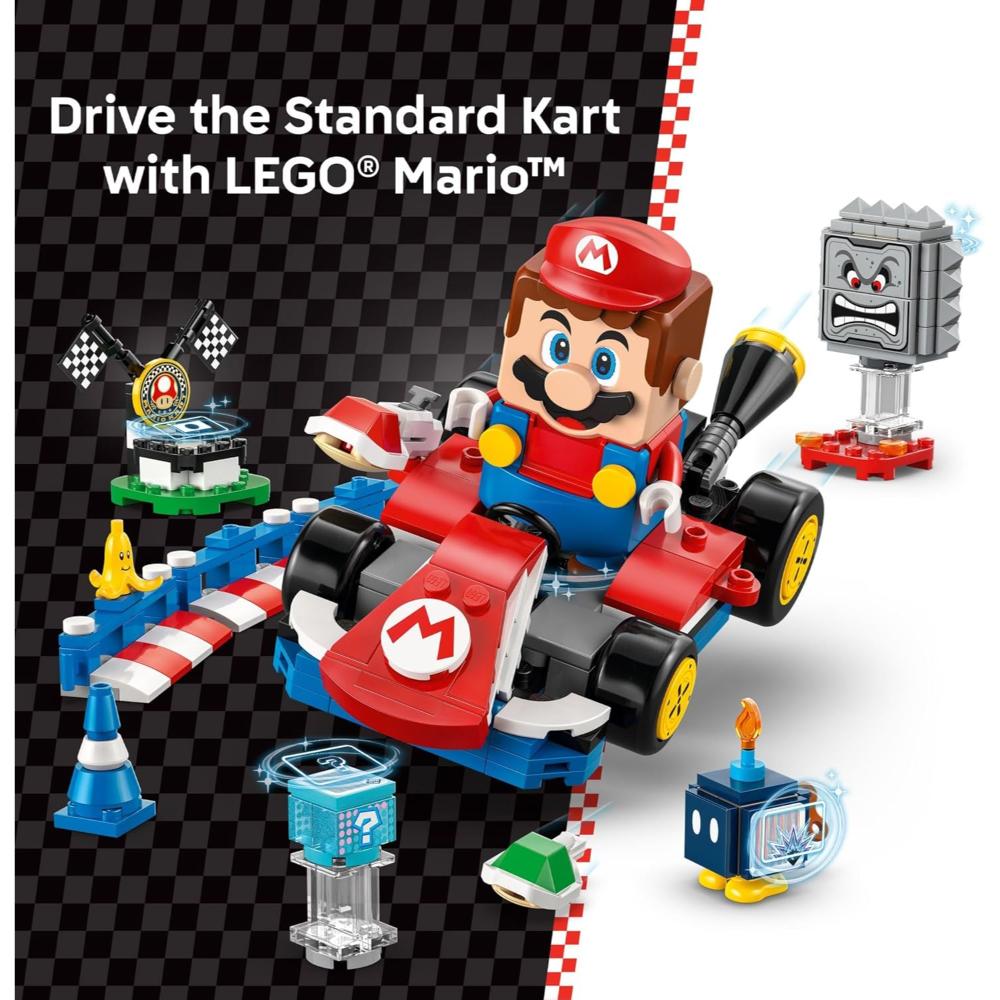 Kids can discover drifting action and a working shell-launcher on the buildable Standard Kart, and expand the racing fun with an Item Box, 3 connectible track barriers, 2 traffic cones, a starting area, and a winner's circle. Young builders can use the interactive LEGO Mario figure to earn digital rewards from the Item Box, defeat the Bob-omb and Thwomp figures, and trigger Mario Kart sound and visual effects by placing him in the Standard Kart.