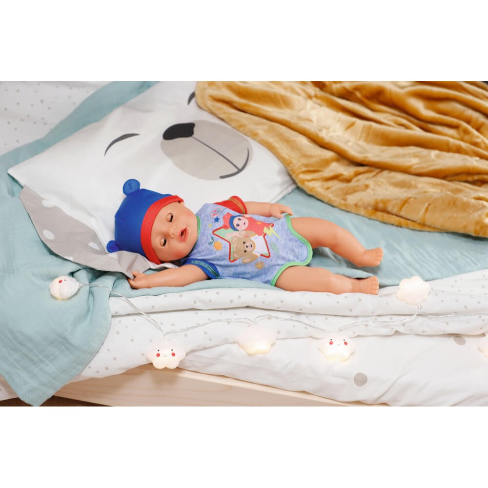 Here comes Jonas! Already known from the BABY Born animation series, which can be seen on YouTube and Toggo, Jonas is now also available in his new outfit and with 10 accessories for you at home. It also has its magical plate: if you put water on the insert surface in the plate, delicious dishes appear there thanks to the water magic, which make the feeding game even more exciting. If you put it on your potty after playing food (with water) or drinking and pressing it on his stomach, his small and her big business appear there. If Jonas drinks water from his bottle, he can even cry and needs to be comforted gently. The magic dummy helps: turn it 180 degrees, close or open your eyes. Twisted again and the opposite happens.
