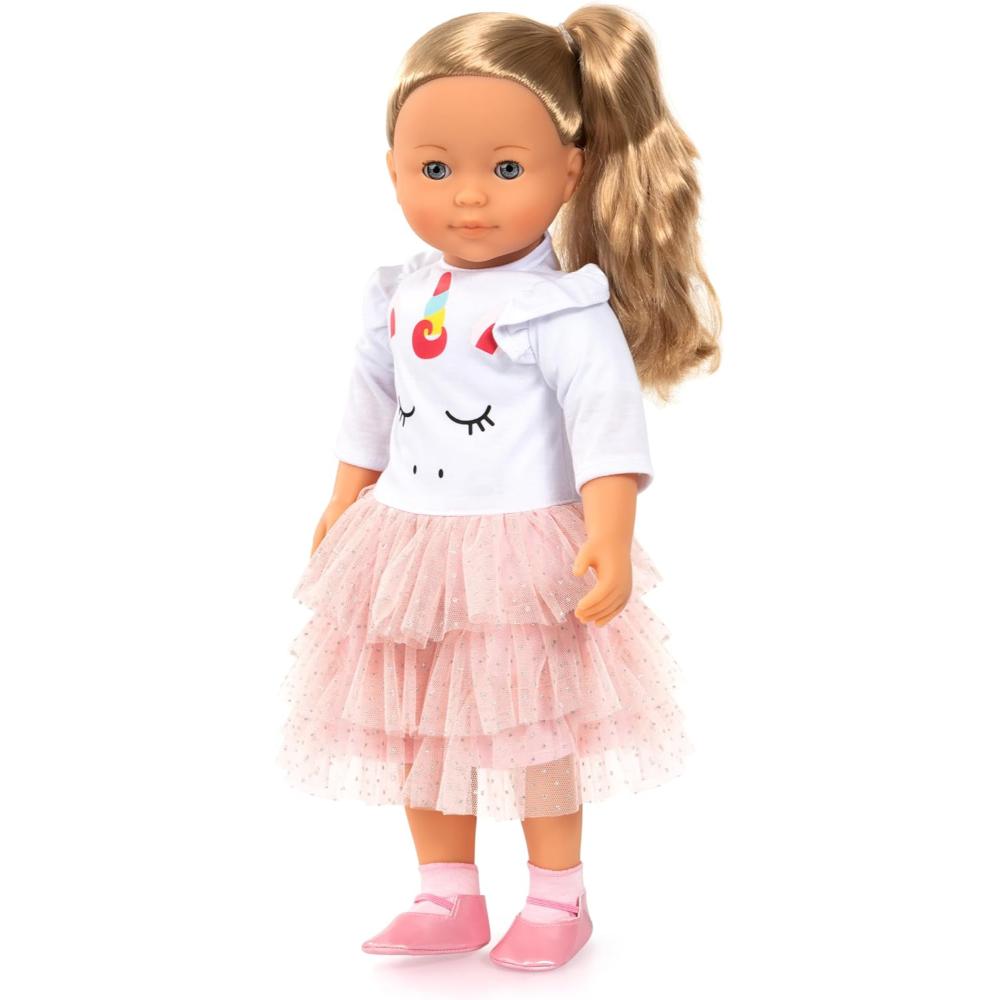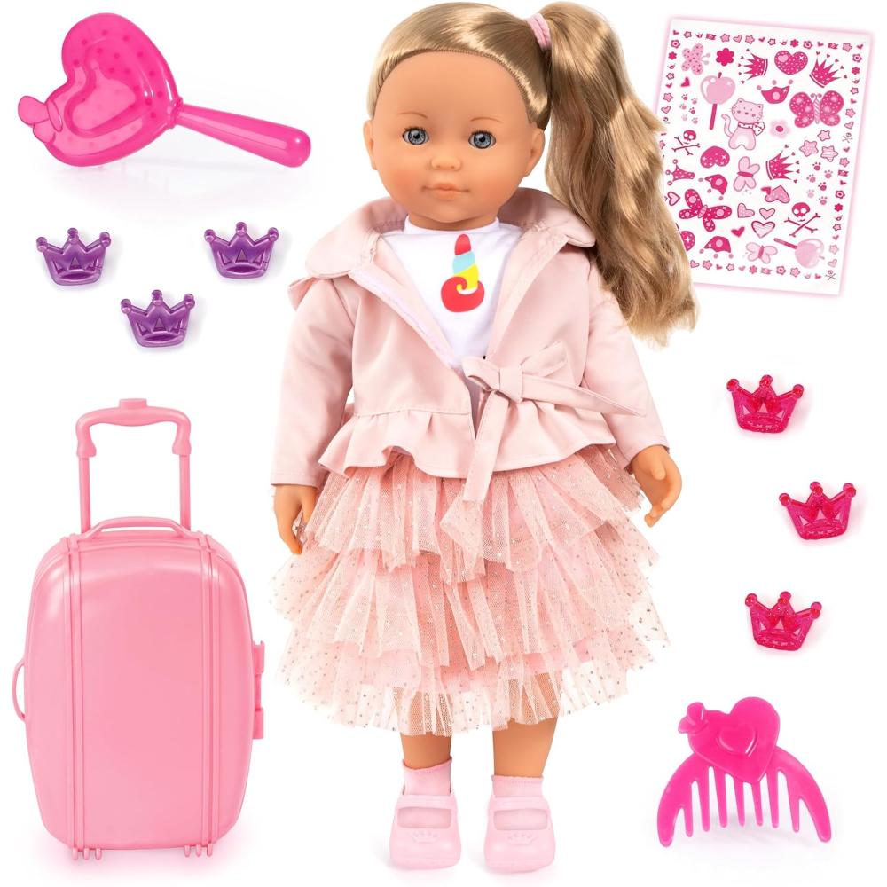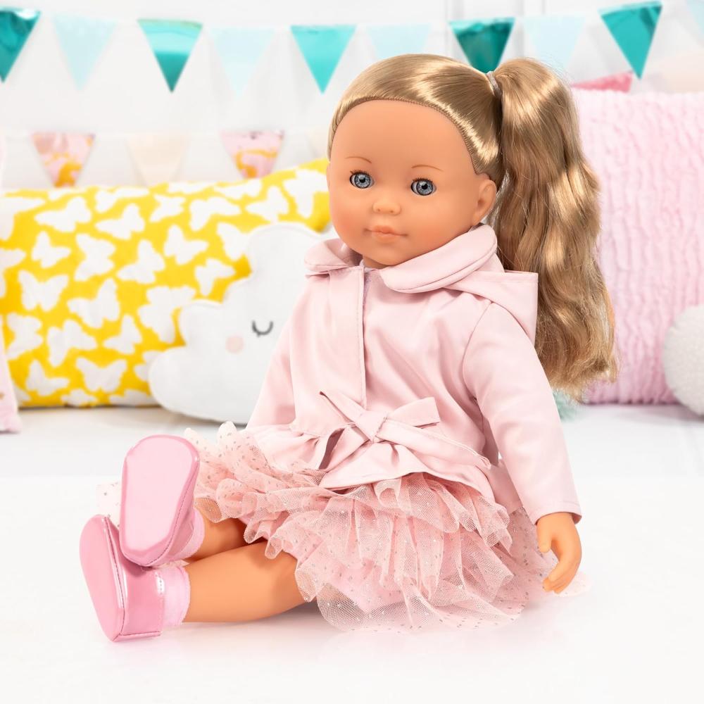 Charlene is your new best friend! She is a beautiful 46 cm soft-bodied doll with sleeping eyes and 100 functions. She speaks 90 sentences, sings 8 songs and presents 2 poems. Charlene wants to play, sing or paint with you. She wears a beautiful soft pink dress and a coat with matching cap, socks and shoes. Hair clips, a comb, brush, a suitcase and stickers are included in the set.