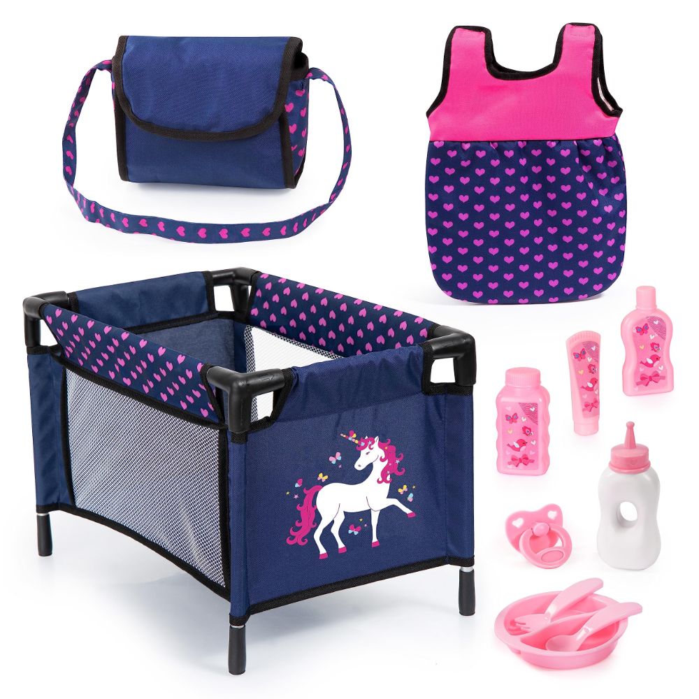 - Baby doll accessories set in modern blue, pink, unicorn design suitable for dolls up to 16,5 inch