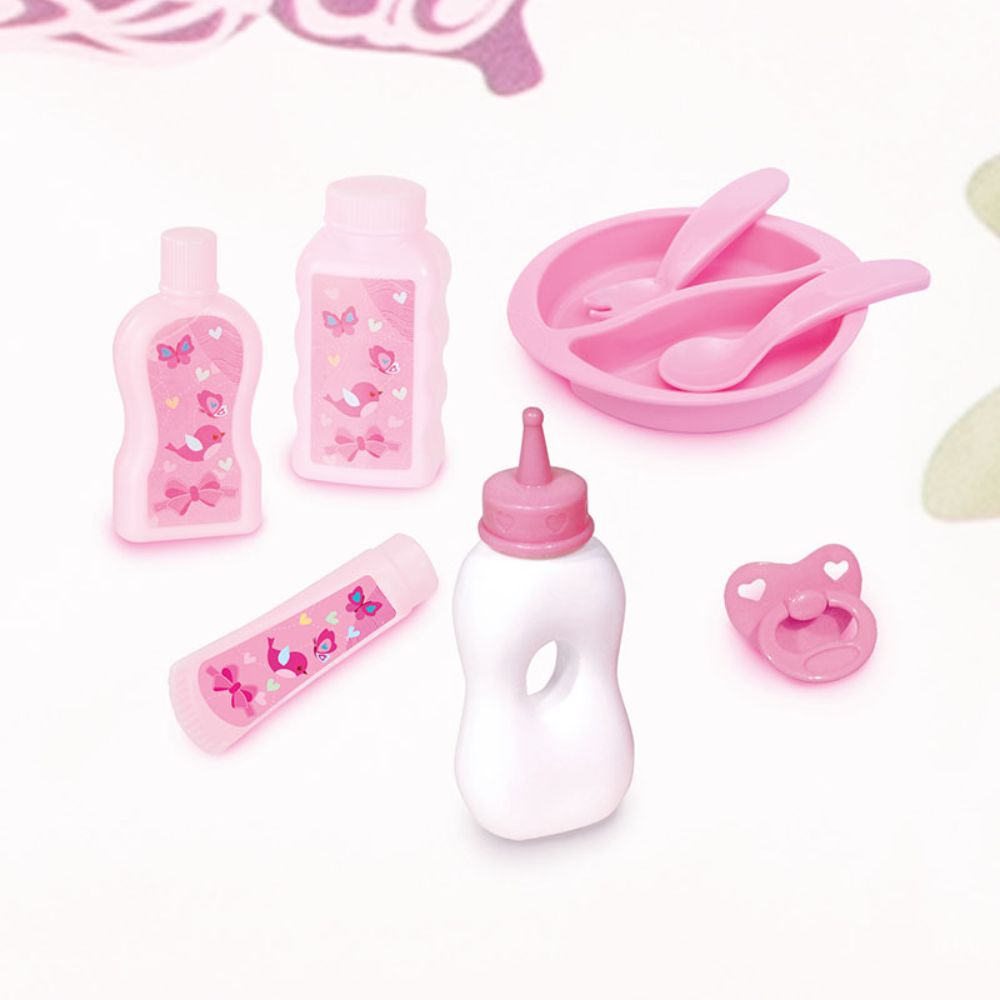 - Doll bottle, dummy, cutlery and care bottles to care and feed the baby doll