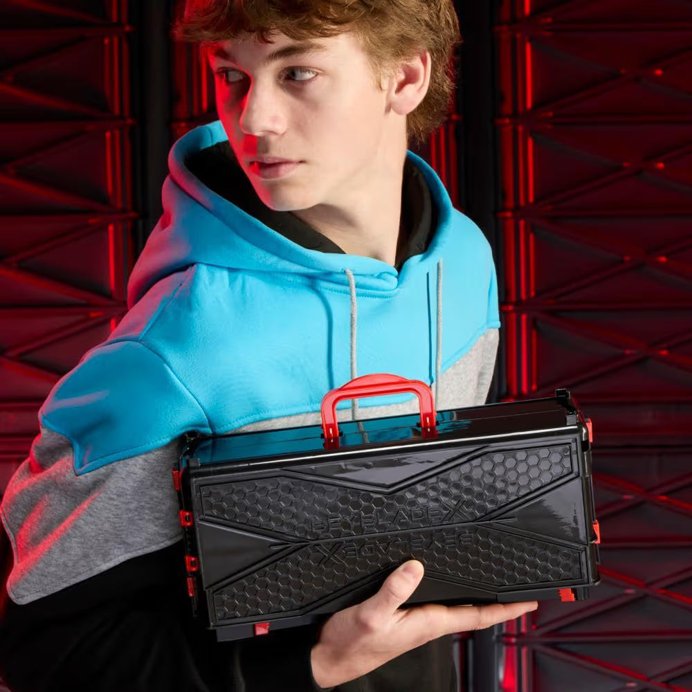 Experience Beyblade X, the next generation of Beyblade stadiums, launchers, and tops! Bladers launch their tops into fierce clashes against their opponent’s to score points – first to score 4 points wins. Bring the battle wherever go with the Beyblade X Clash and Carry Beystadium! This portable stadium opens into a battle arena and folds closed for easy carrying and storage.