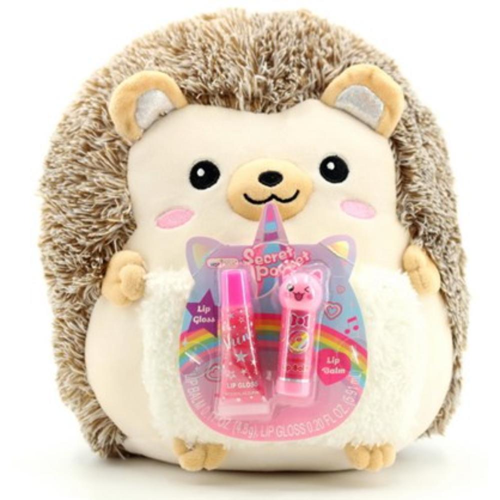 Meet your new cuddle buddy and beauty guru, the Hedgehog Huggy Squeeze Beauty Kit! This lovable plush has a hidden white pocket for storing your strawberry lip balm and lip gloss. Perfect for sleepovers, playtime, and looking cute on-the-go.