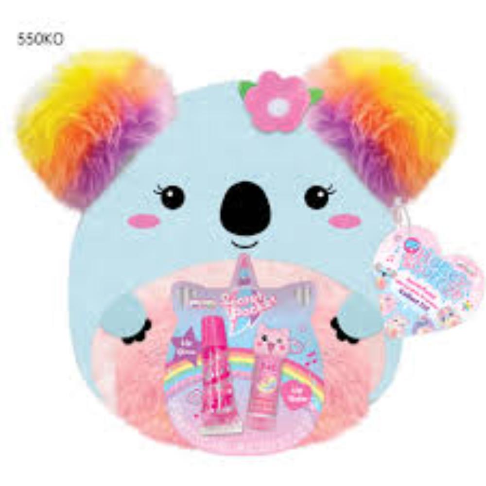 Invite a loveable soft friend to your next sleepover by including this Koala Huggy Squeeze Beauty Kit. This kit features a large plush koala with a secret fuzzy rainbow pocket on its tummy and furry ears. This pocket can hold the strawberry lip balm capped with a cute pink cat and the tube of lip gloss. Keep your adorable friend around whenever you want to cuddle and play with a little makeup!