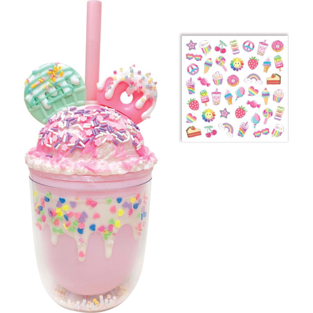 This 350ml mug is made of thick, double-walled plastic for added protection. It features a decorative, convex screw-on cap to prevent spills. Colorful beads are placed under the wall for added decorative effect. A reusable straw and a sheet of glow-in-the-dark stickers are included.