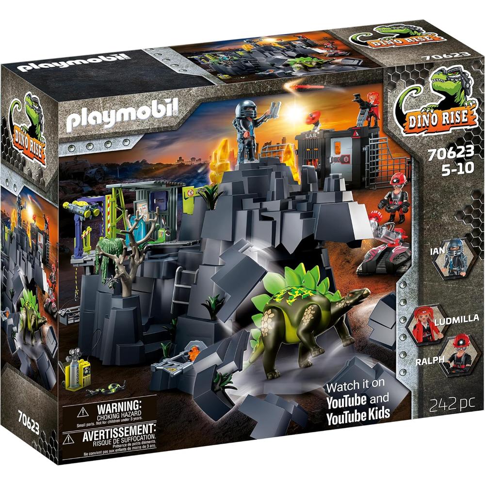 Playmobil Dino Rock with Ian and 1 dinosaur from Team Dino Rise as well as Ludmilla and Ralph from Comet Corporation. Bearing with lift, cannon, folding bridge, slide, rock wall with spin function for dinosaur breakout with sound, energy stones with light, rocks with vibration and much more.